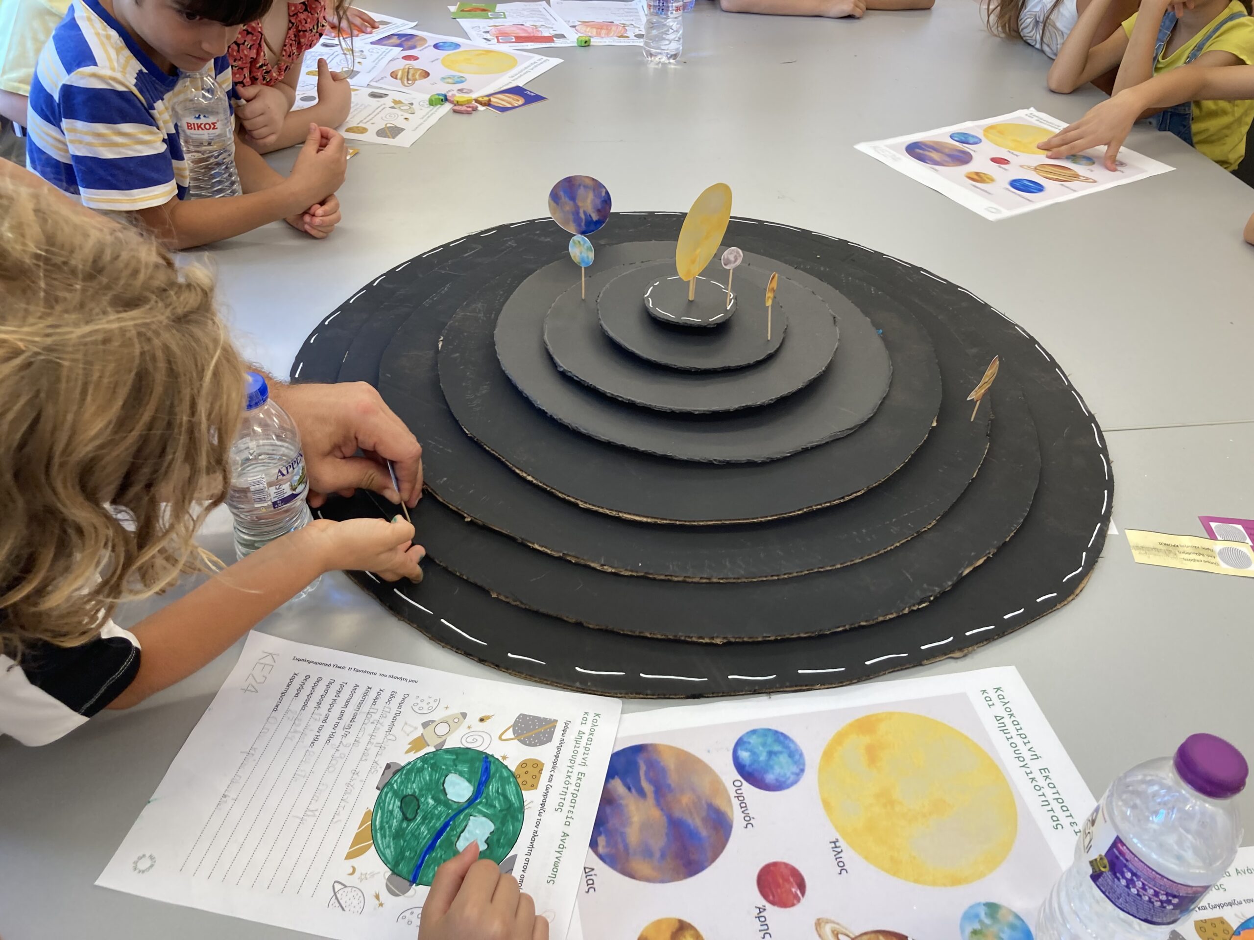 Αρχικά, μιλήσαμε για τις τροχιές των πλανητών, τη θέση τους και τα χαρακτηριστικά τους, και, έπειτα, αναρωτηθήκαμε πως θα ήταν να ταξιδεύαμε στο διάστημα τι θα βλέπαμε, πως θα μας φαινόταν η Γη από χιλιάδες μίλια μακριά, ποιους πλανήτες θα συναντούσαμε και ποια αντικείμενα θα βάζαμε στη διαστημική μας βαλίτσα. Στη συνέχεια, τα παιδιά έπαιξαν ένα κινητικό παιχνίδι, αναπαριστώντας την κίνηση των πλανητών και κατασκεύασαν, με απλά υλικά, ένα μοντέλο του ηλιακού συστήματος! Τέλος, οι μικροί αστροναύτες είχαν την ευκαιρία να παρατηρήσουν τον ήλιο, μέσω ειδικών φίλτρων, με το τηλεσκόπιο της Βιβλιοθήκης, εντυπωσιασμένοι από το μοναδικό θέαμα!