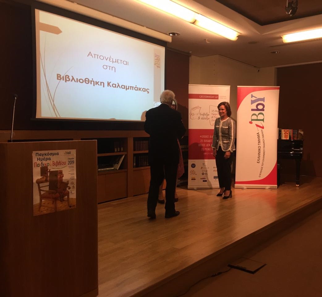 Το Σάββατο 30 Μαρτίου, η Βιβλιοθήκη έλαβε το Βραβείο «Παντελής & Χρήστος Αλέφαντος» από τον οργανισμό Διεθνούς Οργάνωσης Βιβλίων για τη Νεότητα (ΙΒbΥ) – Κύκλος του Ελληνικού Παιδικού Βιβλίου το οποίο δίνεται σε παιδική/νεανική βιβλιοθήκη για τη συνολική της δράση.