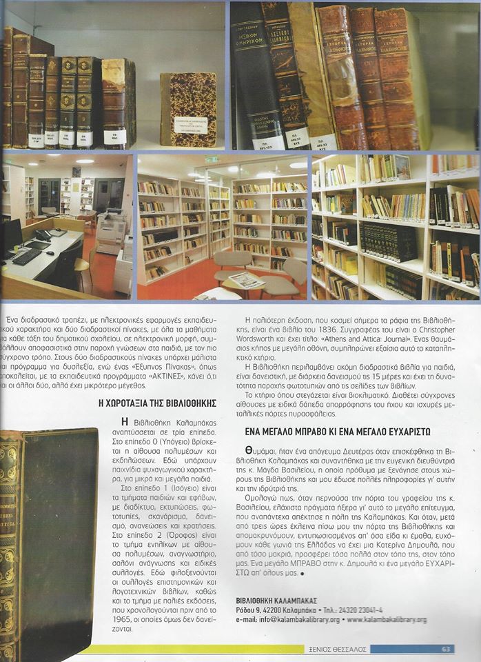 Στο περιοδικό “Ξένιος Θεσσαλός” σελ. 62-63 που κυκλοφόρησε σήμερα 17/9/2016 μαζί με την Εφημερίδα των Συντακτών αναδεικνύεται ο ρόλος της Βιβλιοθήκης.