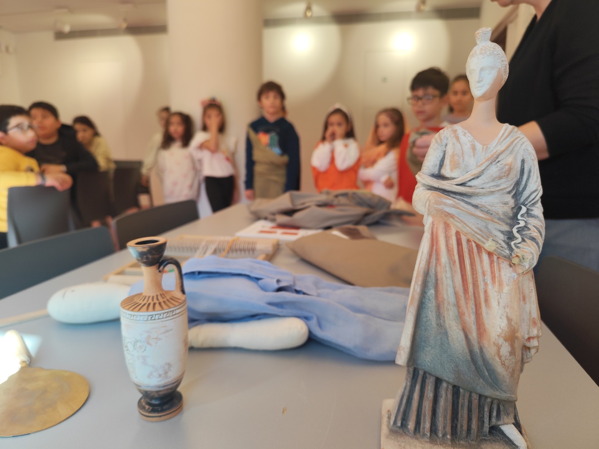 The activity gave the children the opportunity to learn about how the ancient Greeks dressed, the materials they used, and the accessories of the time. Through visual materials, replica artifacts, and reenactments, the young students had the chance to see and try on garments such as chitons, peplos, and himations, experiencing firsthand the daily life of ancient Greece in a unique and engaging way.
