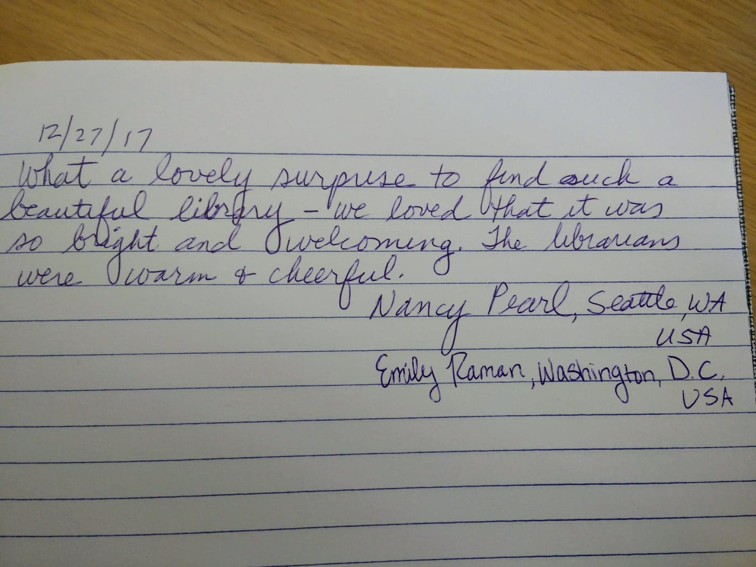 Σήμερα στη Βιβλιοθήκη είχαμε μια ευχάριστη έκπληξη όταν μας επισκέφθηκε η Νάνσι Πέρλ, η οποία έχει λάβει τον τίτλο “Η Πιο Αγαπημένη Βιβλιοθηκονόμος της Αμερικής.” Η κα. Περλ είναι από τους πιο διάσημους βιβλιοθηκονόμους στις ΗΠΑ, και έχει συμβάλλει στην προώθηση της ανάγνωσης στη χώρα. Η ίδια έχει γράψει αρκετά βιβλία επί του θέματος και έχει ακόμη και μία κούκλα-βιβλιοθηκονόμο με τ’ όνομά της.