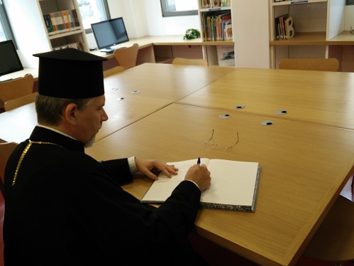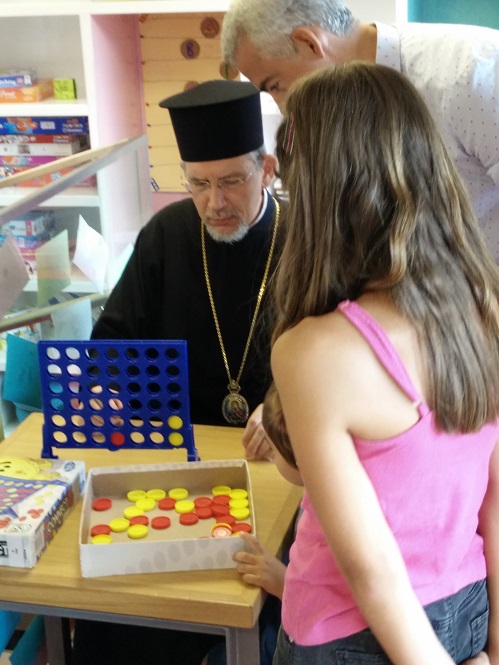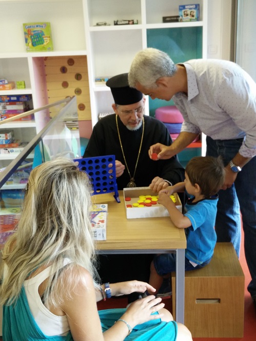 Ο Σεβασμιότατος αφού δήλωσε εντυπωσιασμένος από τις εγκαταστάσεις είχε την ευκαιρία να γνωριστεί, να συζητήσει και να παίξει με τους μικρούς φίλους της Βιβλιοθήκης.