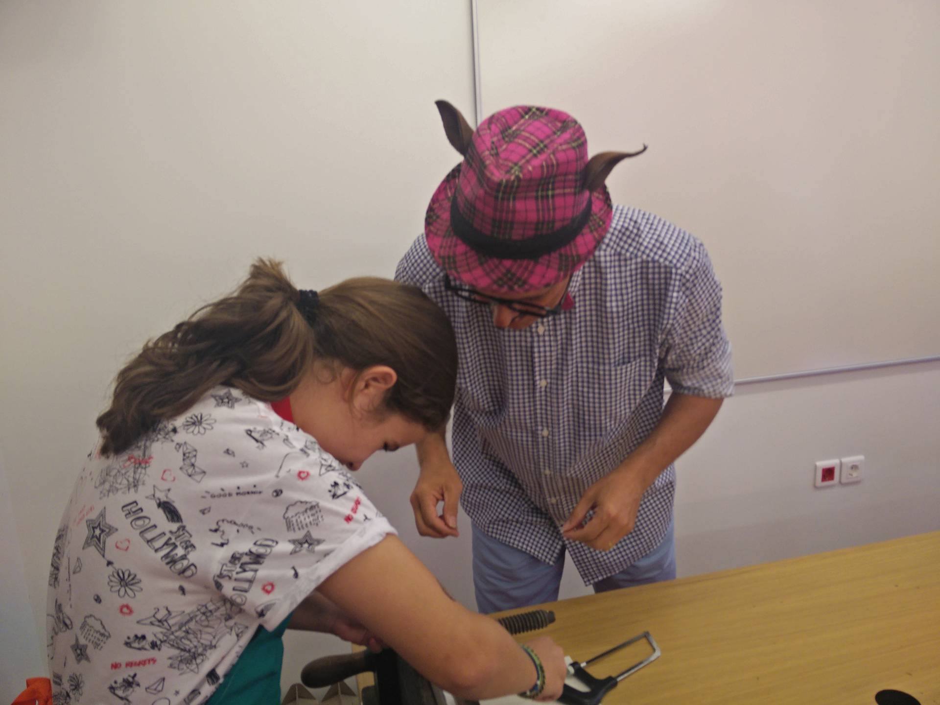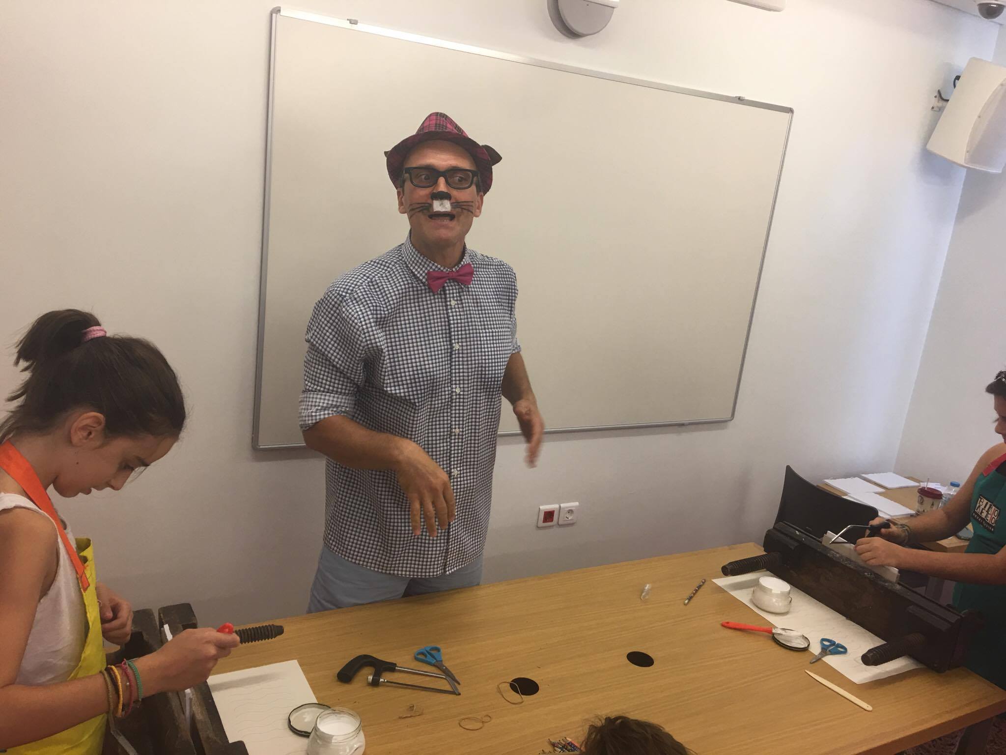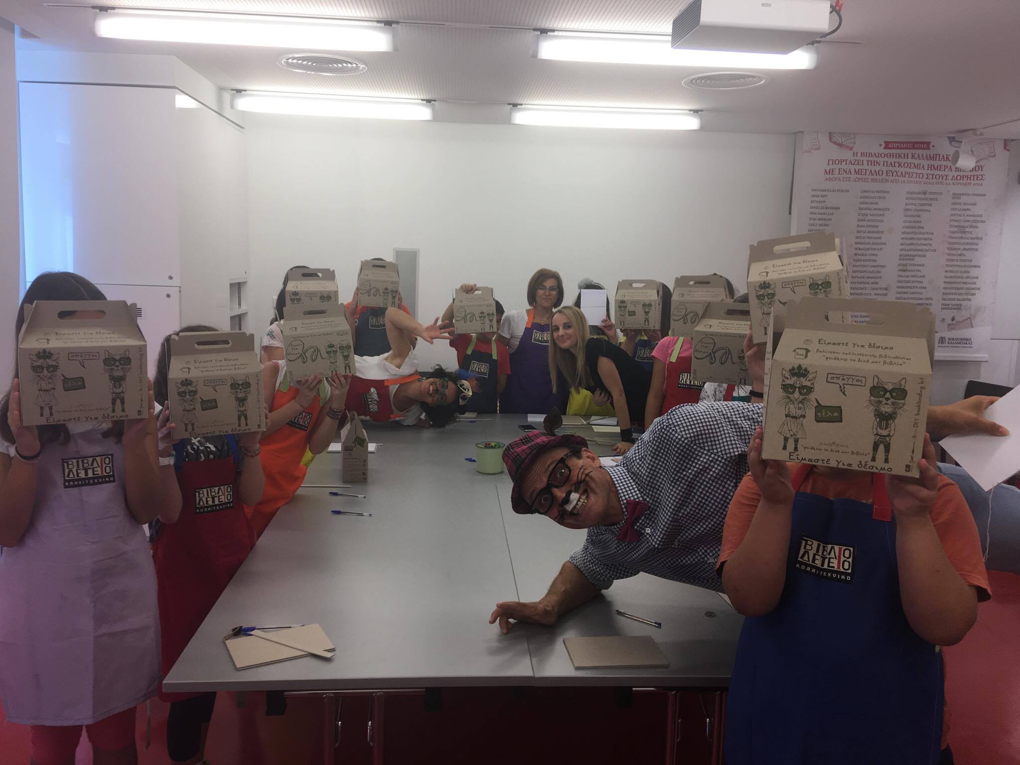Την Τρίτη η Βιβλιοθήκη φιλοξένησε δύο αρκετά ατίθασες γάτες, τον Σπάγγο και την Τέλα, που άφησαν το Καλλιτεχνικό τους Βιβλιοδετείο για μια ημέρα και μας ήρθαν από τη μακρινή “χώρα” της Θεσσαλονίκης. Οι δύο αυτές γάτες λοιπόν, μας ξενάγησαν στον κόσμο της βιβλιοδεσίας με χιούμορ, καλή διάθεση και πειράγματα. Έχοντας φέρει βαλιτσάκια βιβλιοδεσίας που περιείχαν το καθένα τον κατάλληλο εξοπλισμό, έδειξαν στα παιδιά πώς να κατασκευάσουν μόνα τους ένα βιβλίο από το μηδέν, μόνο με τη βοήθεια κάποιων βασικών υλικών όπως κόλλα και χαρτόνια.
