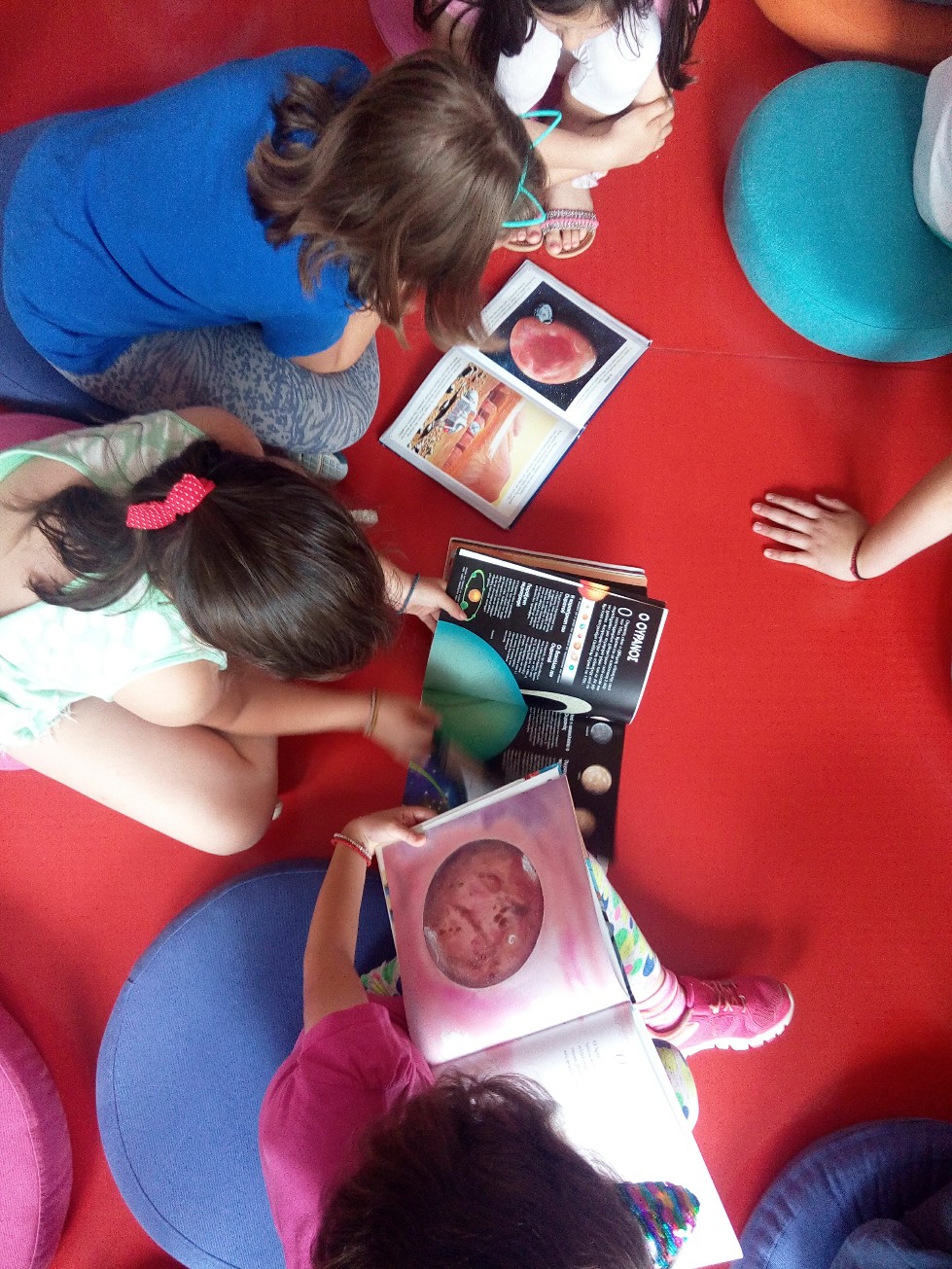 Αρχικά, μιλήσαμε για τον Άρη, την προέλευση του ονόματός του, τους δορυφόρους του και τα ιδιαίτερα χαρακτηριστικά του. Τα παιδιά παρακολούθησαν κάποια σύντομα βίντεο και κατέφυγαν σε βιβλία και φωτογραφίες ώστε να αντλήσουν πληροφορίες για το μέγεθος, τη σύσταση και την επιφάνειά του. Έπειτα, υπολόγισαν πόσο θα ζύγιζαν στον Κόκκινο Πλανήτη, έμαθαν για τα μέρη της στολής των αστροναυτών και σχεδίασαν σε χαρτί τις δικές τους στολές.