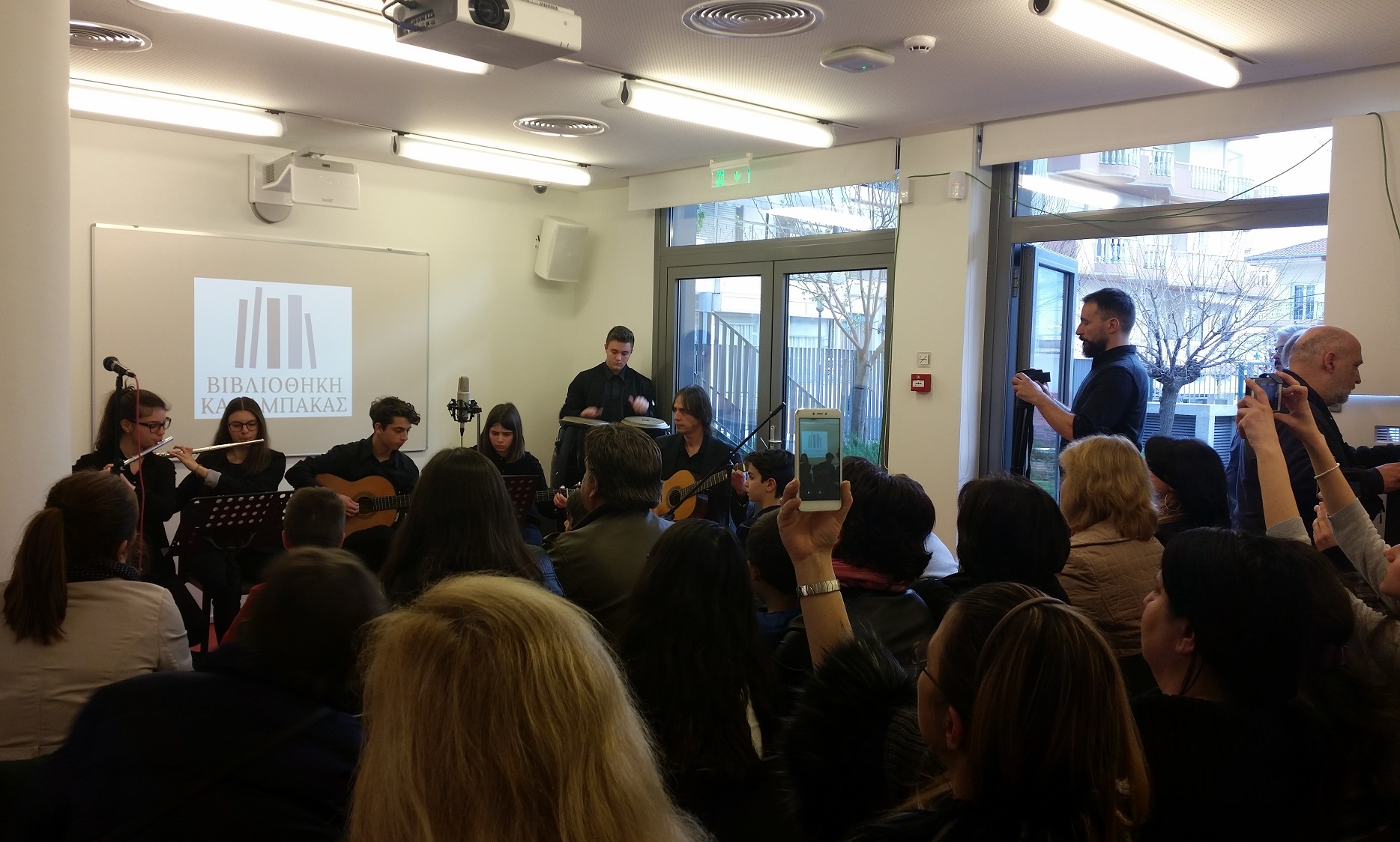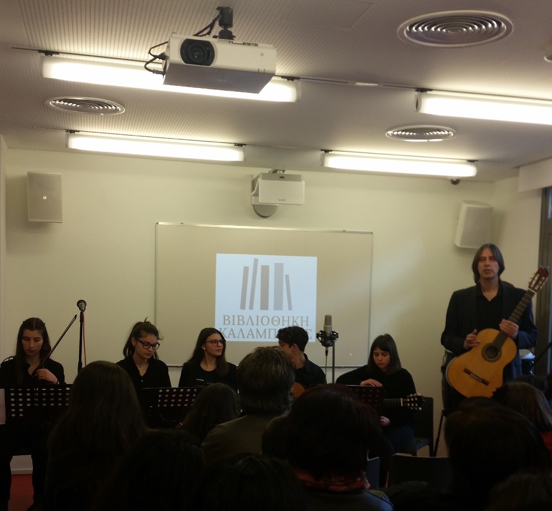 Όσοι παρευρέθηκαν την Τετάρτη στη Βιβλιοθήκη, είχαν την ευκαιρία να παρακολουθήσουν μία μουσική παράσταση από τους μαθητές του Μουσικού Σχολείου Τρικάλων. Το πρόγραμμα που εκτέλεσαν περιείχε μουσικά κομμάτια από ταινίες όπως: O Άρχοντας των Δαχτυλιδιών και οι Πειρατές της Καραιβικής, σειρές όπως το Game of Thrones, αλλά και επιλεγμένα κομμάτια του Μάνου Χατζηδάκι.