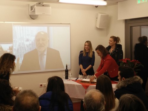Πριν από την κοπή, η δωρήτρια της Βιβλιοθήκης κ. Δημουλά αφηγήθηκε ένα αμερικάνικο παραμύθι στους μικρούς μας φίλους. Στη συνέχεια, η αντιδήμαρχος πολιτισμού κ. Σοφία Δρούγκα, η κ. Δημουλά και η διευθύντρια της Βιβλιοθήκης κ. Πέπη Κατσιαμάνη έκοψαν την πίτα. Στην εκδήλωση παρευρέθηκε μέσω σύνδεσης Skype και ο αντιπρόεδρος του Διοικητικού Συμβουλίου, κ. Ηλιόπουλος, ο οποίος με τη σειρά του ευχήθηκε σε όλους Καλή Χρονιά, γεμάτη υγεία και χαρά.