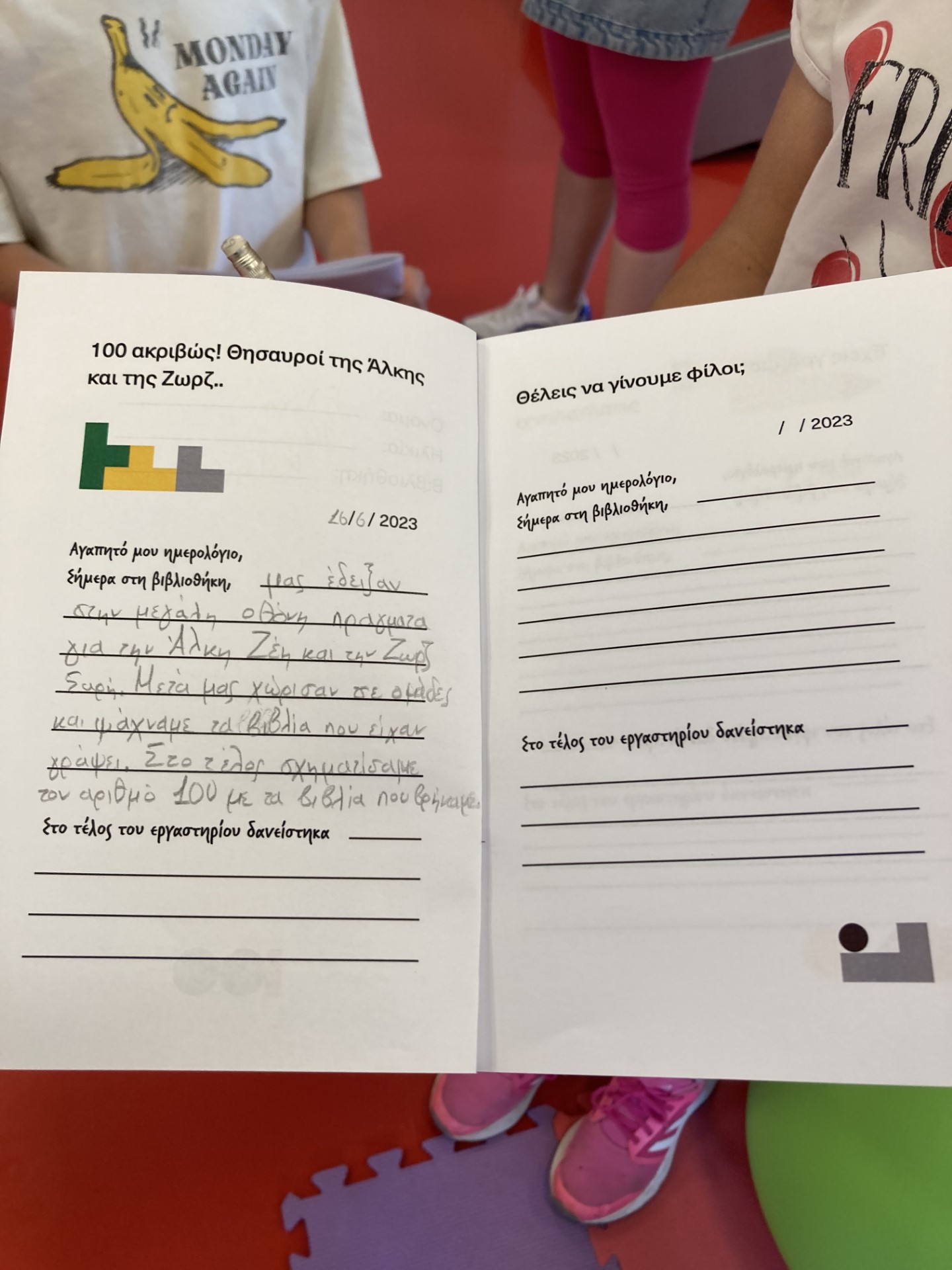 Αρχικά, τα παιδιά έμαθαν κάποιες πληροφορίες για τη ζωή και το έργο της Άλκης Ζέη και της Ζώρζ Σαρή, που φέτος συμπληρώνονται 100 χρόνια από τη γέννησή τους. Στη συνέχεια, χωρίστηκαν σε δυο ομάδες, στην ομάδα «Ζώρζ» και στην ομάδα «Άλκη», με αποστολή να εντοπίσουν στη Βιβλιοθήκη τίτλους των δυο αγαπημένων συγγραφέων. Έπειτα, με τα βιβλία που βρήκαν σχημάτισαν τον αριθμό εκατό, σηματοδοτώντας έτσι την έναρξη της ΚΕ 2023! Τέλος, όλα τα παιδιά πήραν ένα ημερολόγιο της ΚΕ για να γράφουν τις εντυπώσεις τους από τη συμμετοχής τους στα εργαστήρια και δανείστηκαν βιβλία για το σπίτι.
