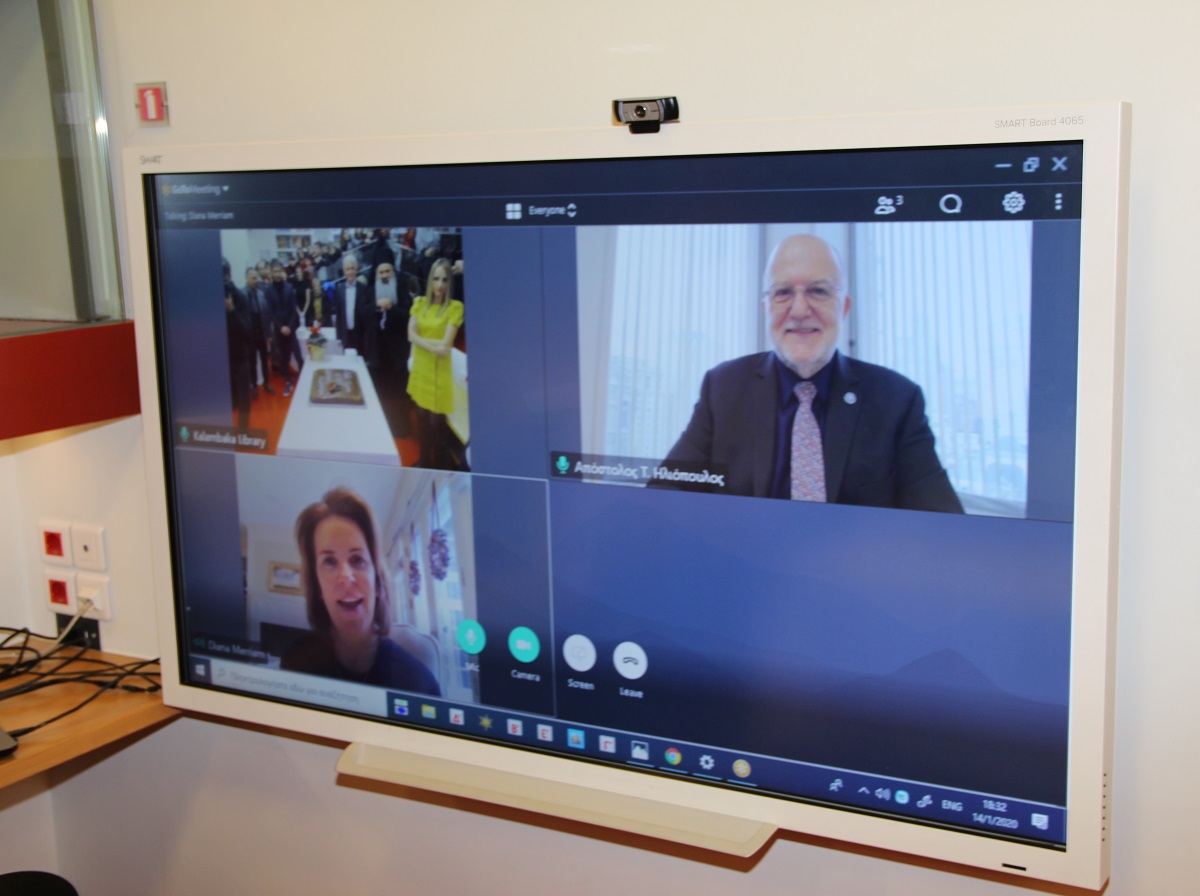 Η δωρήτρια κα Κατερίνα Δημουλά και ο αντιπρόεδρος της KDK κ. Απόστολος Ηλιόπουλος αντάλλαξαν ευχές με τους παρευρισκόμενους μέσω τηλεδιάσκεψης, καθώς βρίσκονται στην Αμερική.