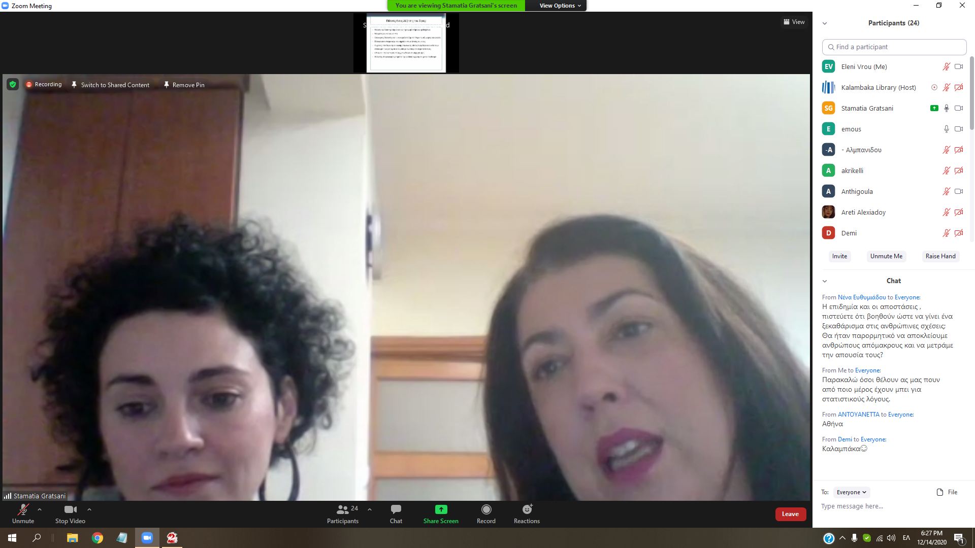 Εισηγήτριες της τηλεδιάσκεψης ήταν οι κυρίες Χριστίνα Βάγια, Ψυχολόγος MSc – Ψυχοδυναμική ψυχοθεραπεύτρια και Χριστίνα Ποποντοπούλου, Ψυχολόγος – Συστημική Ψυχοθεραπεύτρια, οι οποίες αναφέρθηκαν στην αύξηση του στρες και του άγχους την περίοδο που διανύουμε. Έδωσαν έμφαση στις πιθανές ψυχολογικές αντιδράσεις λόγω της κοινωνικής αποστασιοποίησης, συμβουλές για τη διαφύλαξη της ψυχικής υγείας, ενώ τόνισαν τη σημασία της αναζήτησης διεξόδων και δραστηριοτήτων.