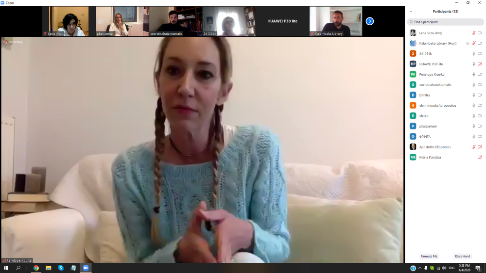 Με συμμετοχή αρκετών φίλων της Βιβλιοθήκης πραγματοποιήθηκε, το απόγευμα του Σαββάτου 4/4/2020, η τηλεδιάσκεψη με τη συγγραφέα κα Πηνελόπη Κουρτζή, δίνοντας μια διαφορετική και ευχάριστη νότα στη καθημερινότητά μας.