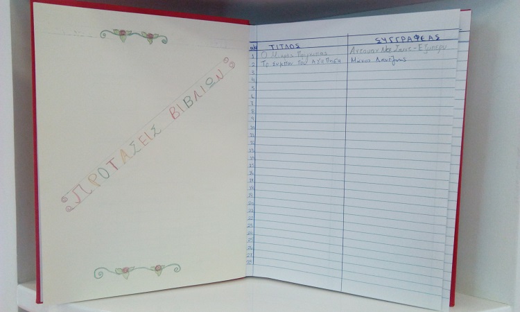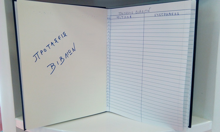 Για τον σκοπό αυτό μπορείτε συμπληρώνετε τα “Βιβλία προτάσεων” που θα βρείτε διαθέσιμα τόσο στο παιδικό τμήμα, όσο και στο τμήμα ενηλίκων της Βιβλιοθήκης.