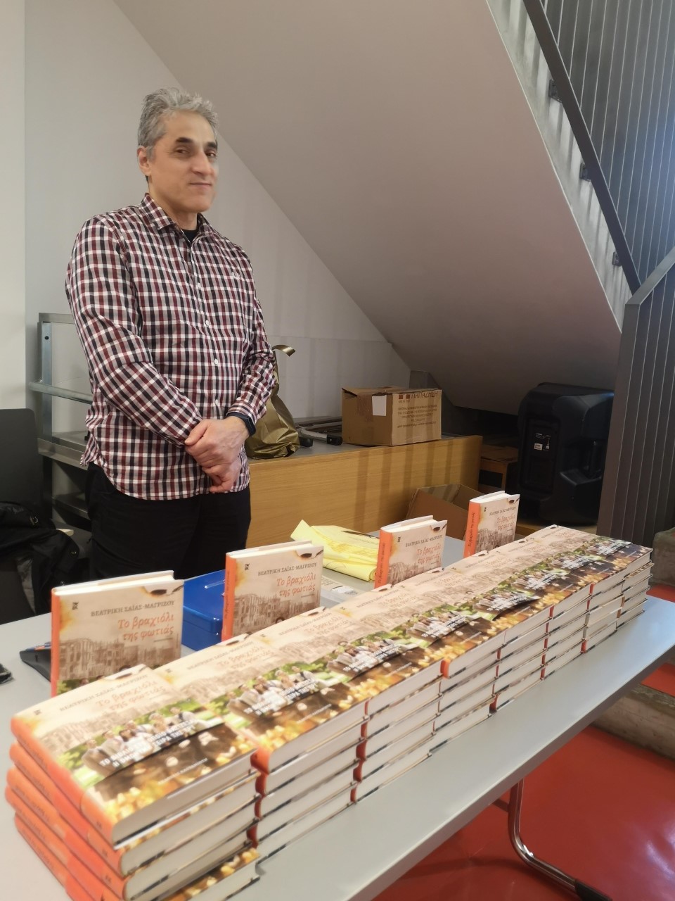 Την Τρίτη 4 Απριλίου πραγματοποιήθηκε η παρουσίαση του βιβλίου της κας Βεατρίκης Σαϊάς – Μαγρίζου «Το βραχιόλι της φωτιάς». Η κα Μαγρίζου ξεκίνησε την ομιλία της λέγοντας πως πρόκειται για το δραματικό οδοιπορικό μιας εβραϊκής οικογένειας, της δική της οικογένειας, όπως το διηγήθηκε στην ίδια ο πατέρας της και στην υπόσχεση που του έδωσε να καταγράψει την ιστορία του. Η ιστορία ξεκινά με τη μεγάλη πυρκαγιά της Θεσσαλονίκης το 1917 για να συνεχίσει μέχρι και τον Δεύτερο Παγκόσμιο Πόλεμο και το κολαστήριο του Άουσβιτς. Η κα Μαγρίζου τόνισε ότι δεν πρόκειται για ένα βιβλίο μίσους, αλλά μνήμης και αισιοδοξίας για το μέλλον και τη ζωή.